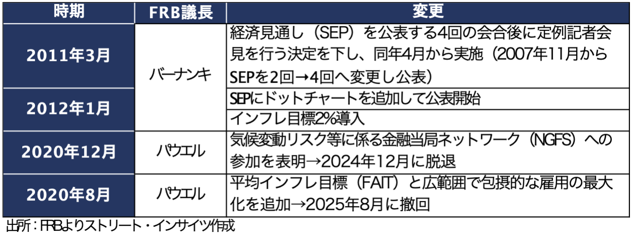第1弾として、2011年3月に年8回開催される米連邦公開市場委員会(FOMC)のうち経済見通しを公表する4回の会合後に定例記者会見を行う決定を下した。第2弾・第3弾は2012年1月25日に一体として実施され、SEPにFF金利見通し(ドットチャート)が加わるとともに、2%のPCE価格指数を長期目標とするインフレ目標が正式に導入された。数値目標を掲げた上でその達成に向けた政策金利の見通しを示すという、透明性強化の一体的なパッケージとして位置づけられる。ジェローム・パウエル議長はコロナ禍で2020年8月に①物価目標について単年の2%達成ではなく一定期間の平均で2%を目指す柔軟な平均インフレ目標(FAIT)の採用、②雇用の「乖離」ではなく「下振れ」への対応という広範かつ包摂的な雇用の最大化を目指す文言への改定――を率いた。2020年11月の米大統領選で民主党のジョー・バイデン候補が勝利した直後2020年12月には、気候変動リスク等に係る金融当局ネットワーク(NGFS)への参加を表明。しかし、2025年1月にトランプ大統領就任に合わせてNGFSから脱退したほか、柔軟な平均インフレ目標、広範かつ包摂的な雇用の最大化については、2025年8月に撤回した。
