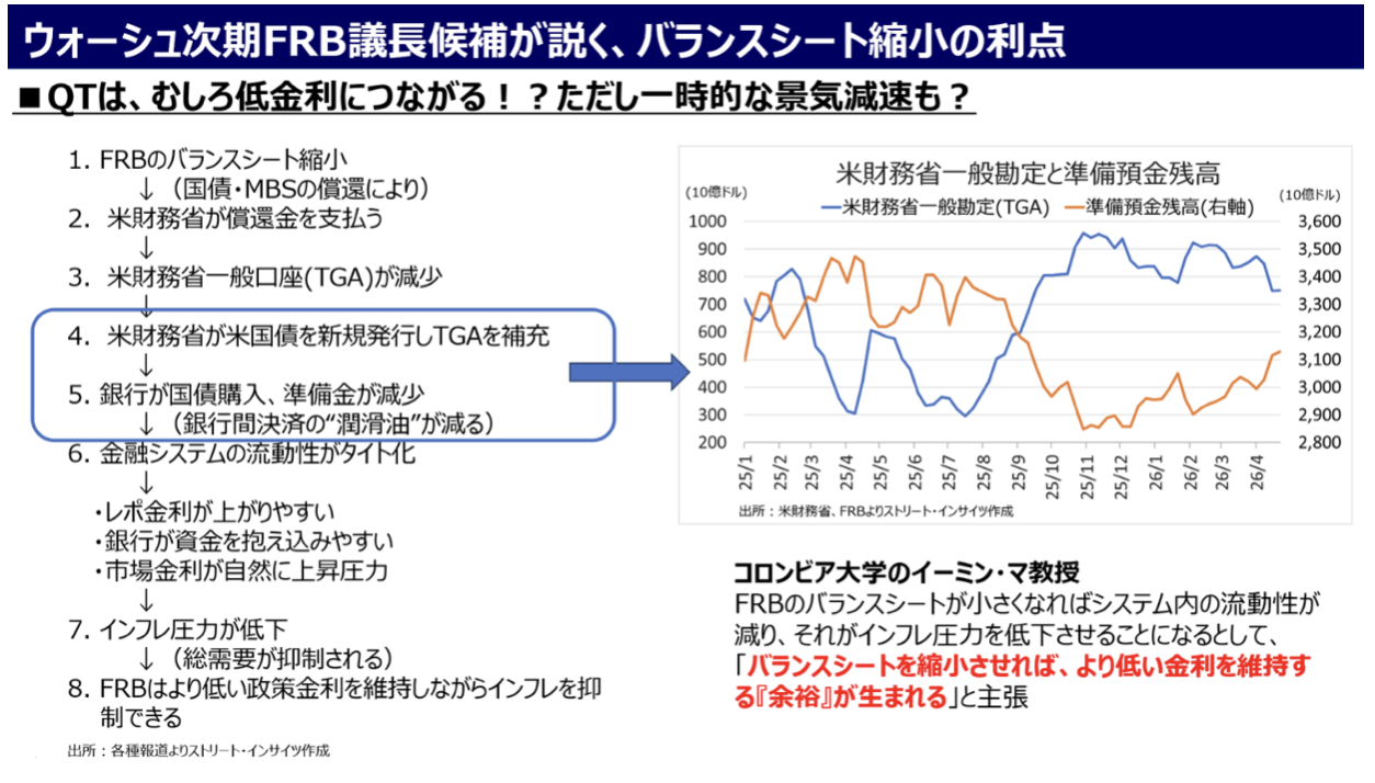 バランスシートの縮小に肯定的な発言が飛び出した結果、米10年債利回りの上昇とドル高を促した。一般的にバランスシートの縮小は量的引き締め(QT)とも呼ばれ、引き締め効果につながり、金利上昇要因とされてきたためだ。しかし、コロンビア大学ビジネススクールのイーミン・マ教授は「バランスシートを縮小させれば、より低い金利を維持する『余裕』が生まれる」と説明、ウォーシュ氏の見解を支持する。そのQTが低金利をもたらす経路は以下の通りで、①FRBが保有する国債の償還→②米財務省がFRBに償還金を支払いTGAが減少→③財務省が新たに国債を発行→④銀行が国債を購入し準備金が減少→⑤市場の流動性が低下→⑥金利が上昇→⑦インフレ圧力が低下→⑧FRBが政策金利を引き下げる余地が生まれる――というもの。ただしQTに踏み切った場合、流動性低下・金利上昇局面では企業融資が厳格化され、景気減速につながる二面性も持つ。
