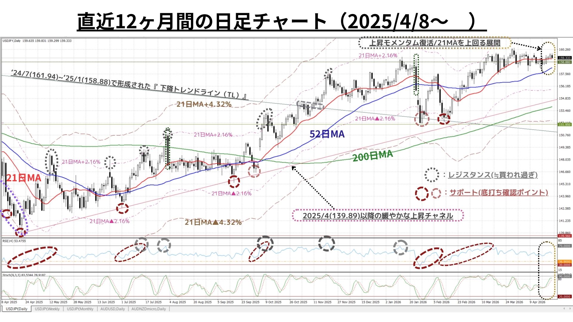 ➊日足チャート:「21MA±4.32%のバンド、52MA & 200MA」、RSI等