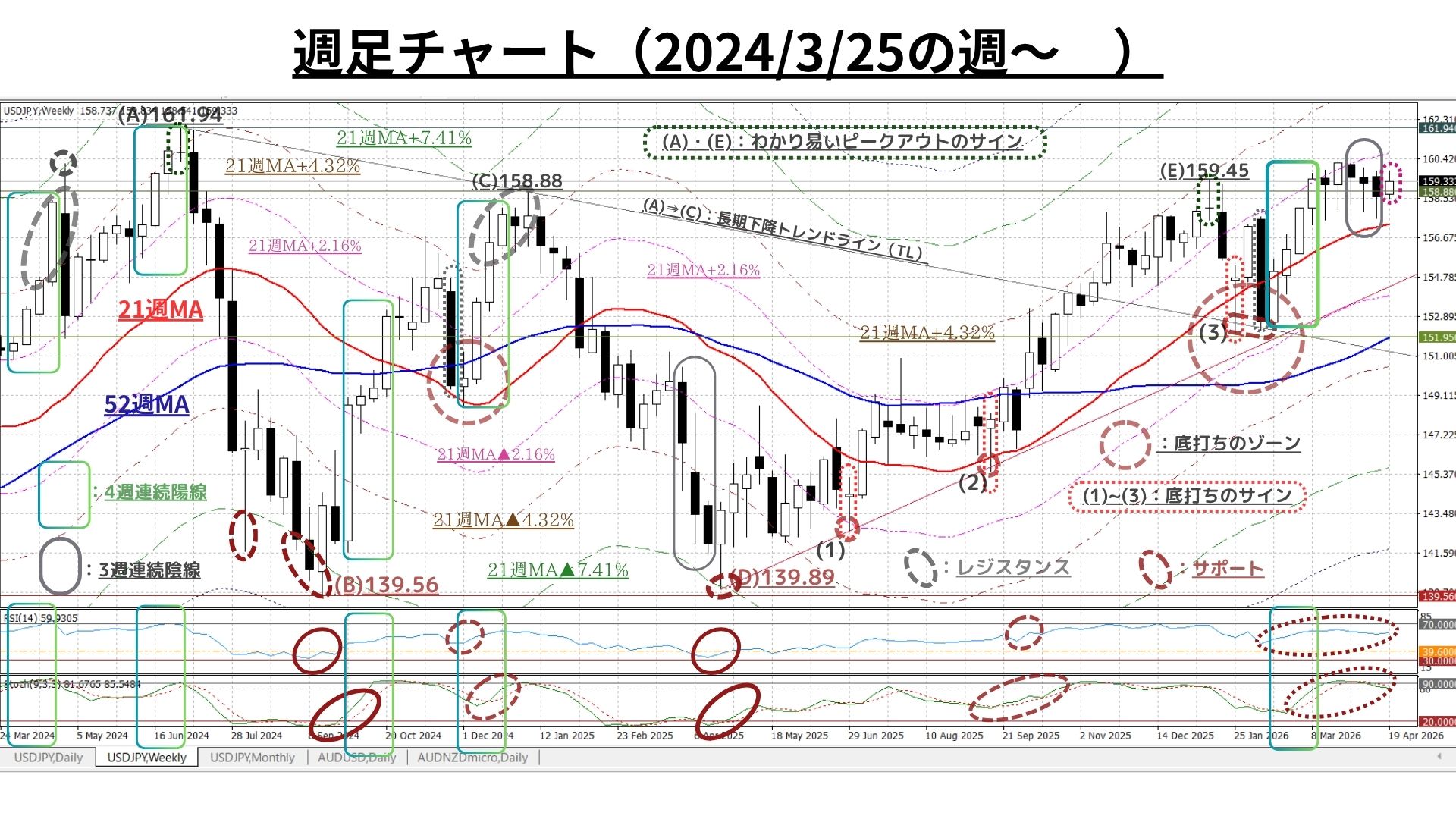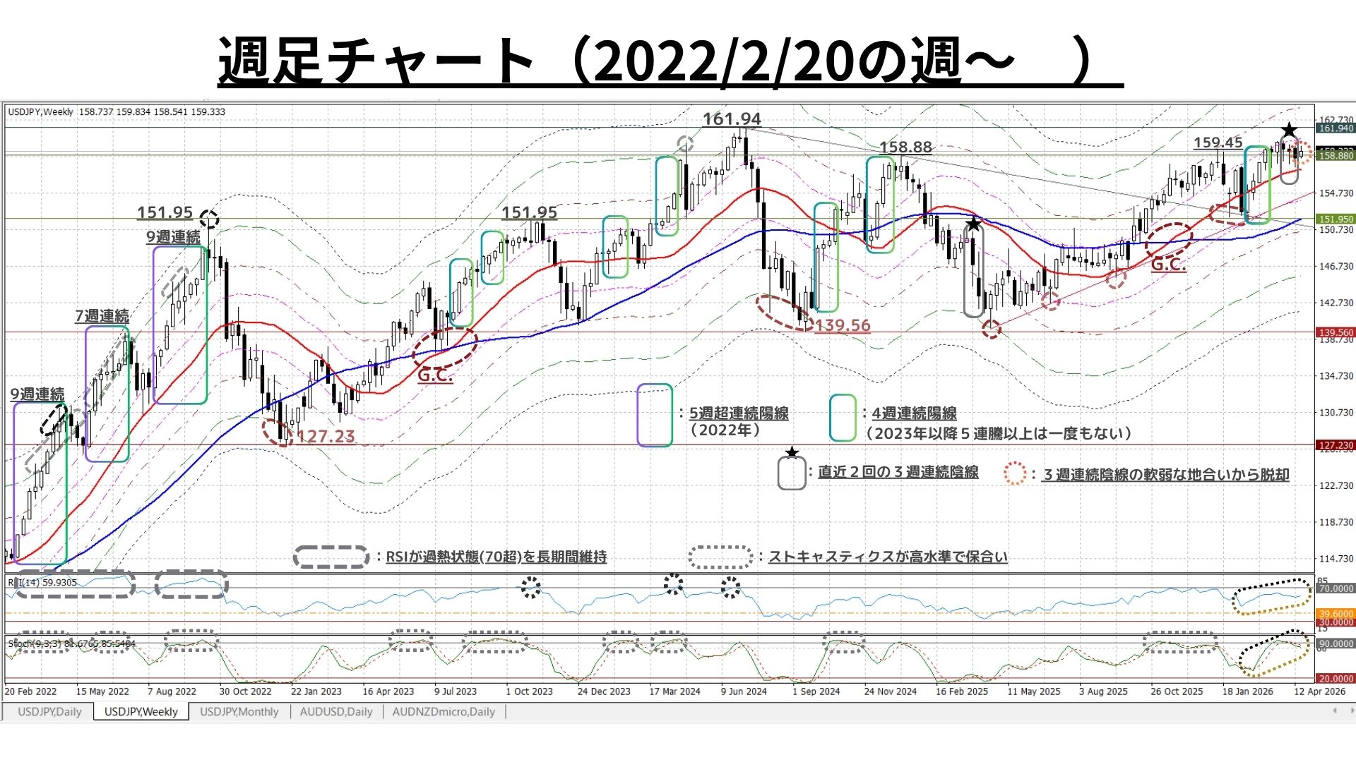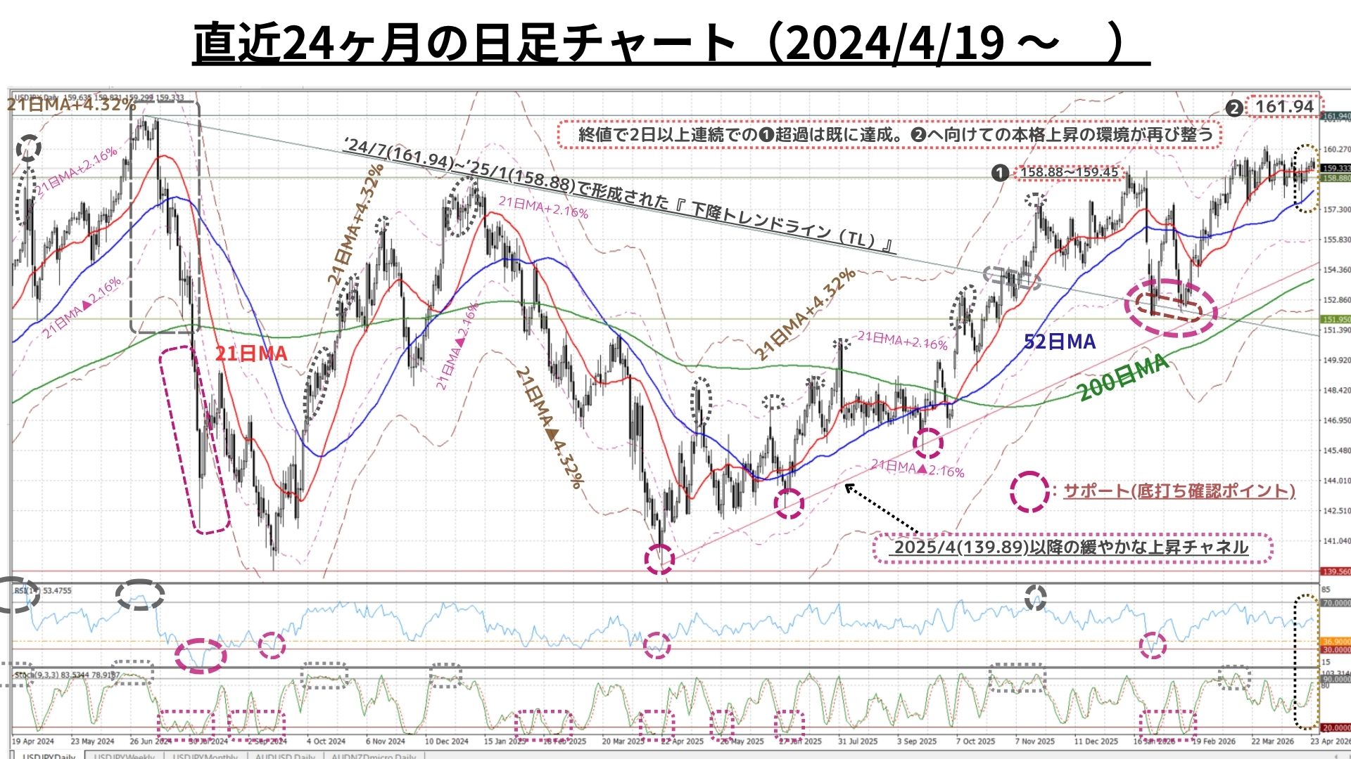 〇①「2024年12月以来となる4週連続陽線(2/16~3/13 : 152.64→159.75/ +7.11円)」と、②「昨年4月以来の3週連続陰線(3/30~4/17 : 160.45→157.59/ ▲2.86円)」=>連続週の差は僅か1週だが、値幅(モメンタム≒勢い)の差(①>②)は歴然