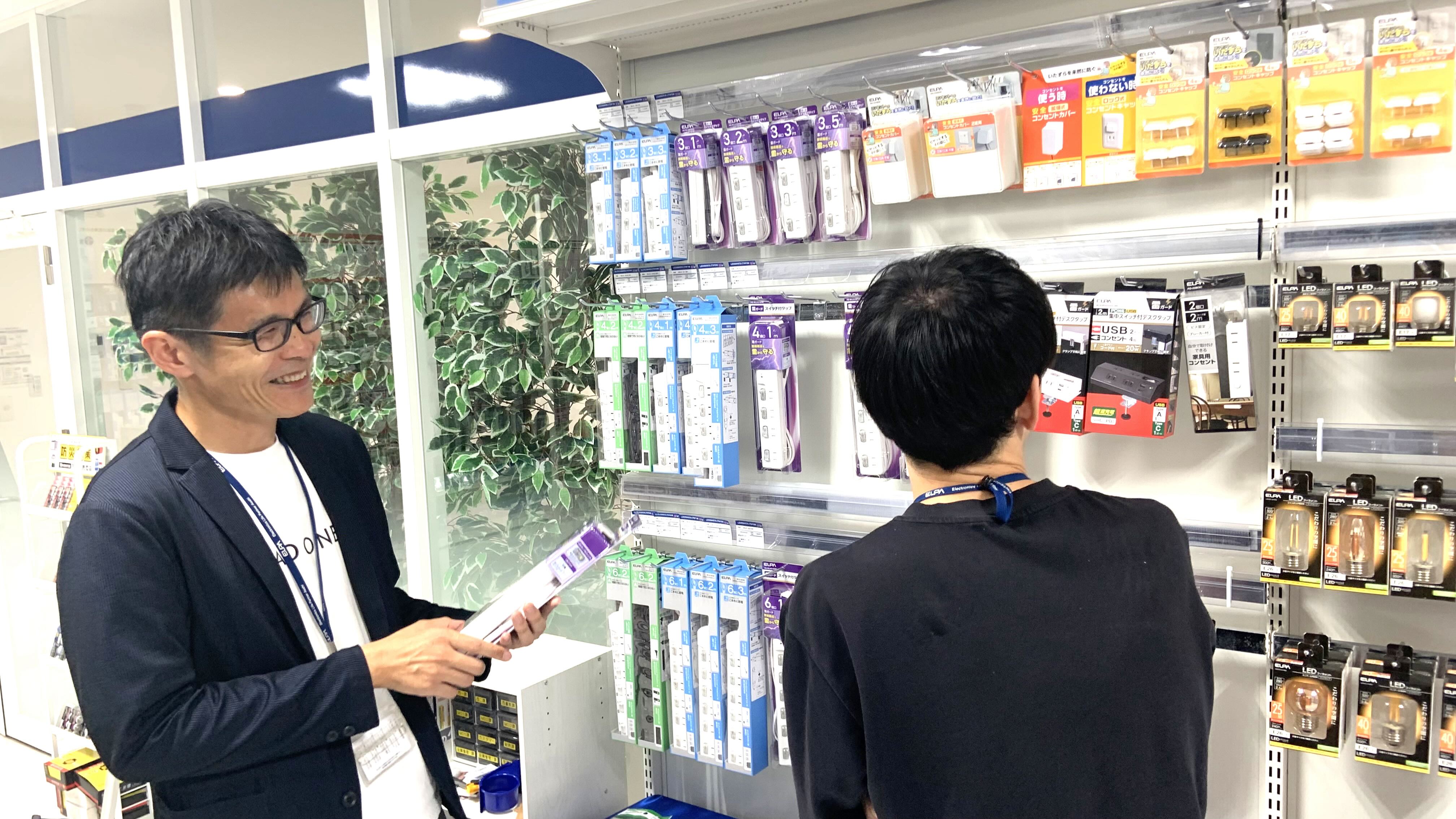 当社の事業は、ホームセンターや家電量販などの小売店を中心に、電器にまつわる製品を幅広く取り扱っています。具体的には、どのテレビにも汎用的に使えるリモコンや、電源タップや延長コードといった配線器具などです。