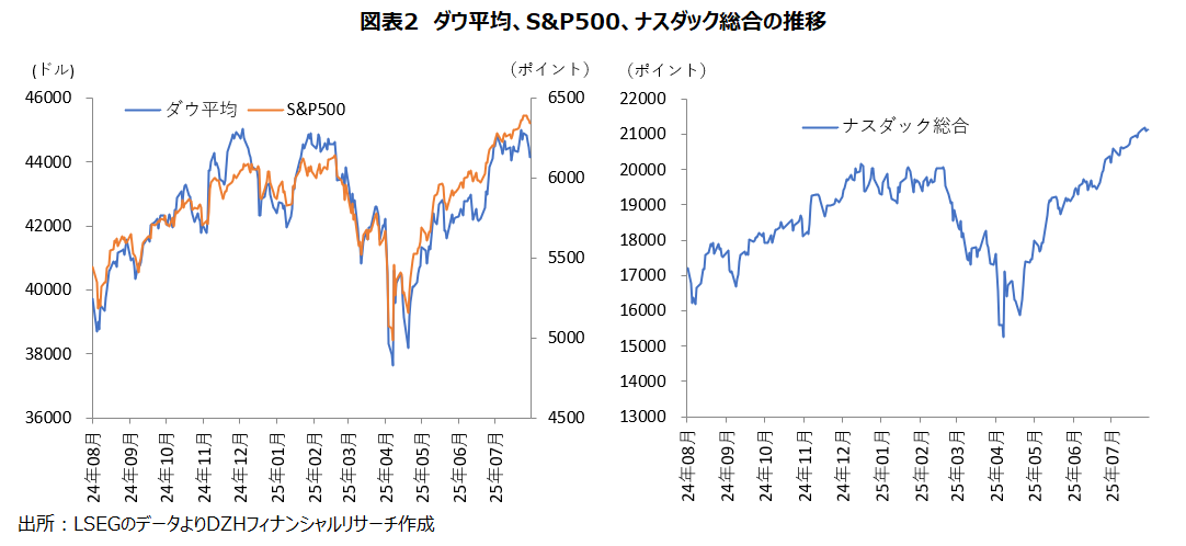 中旬はトランプ米大統領がカナダからの輸入品に対して35%の関税を8月1日から課すと発表し、欧州連合(EU)とメキシコからの輸入品に対しても8月1日から30%の関税を課すと発表したことで関税問題が再び相場の重しとなりました。しかし、新規失業保険申請件数や6月小売売上高などが予想を上回る強い結果となり景気減速懸念が和らいだことや、発表がスタートした第2四半期決算発表が総じて良好な結果となったことが支援となり米国株は再び騰勢を強めました。