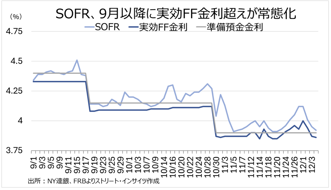 準備預金残高が減少する過程で、銀行間で短期資金を無担保で融通し合うFF金利の上昇だけでなく、MMFや証券会社、ヘッジファンドなどが資金を調達する翌日物レポ市場で、短期資金調達コスト(Secured Overnight Financing Rate=SOFR、担保付翌日物調達金利)が上昇。一般にSOFRは「担保付きの翌日物レポ金利」、FFは「無担保の翌日物資金」であり、SOFRの方が低く出やすい構造にある。ただし、SOFRの上昇は資金・担保需給の逼迫と、流動性支援が必要な状況を示唆したと言えよう。