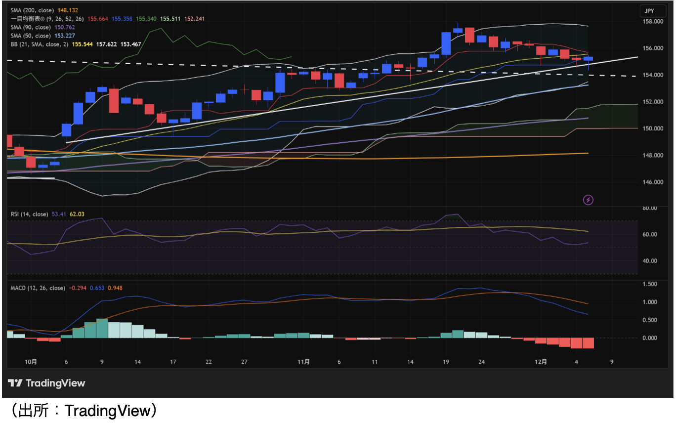 1日のドル円は、売り優勢。トランプ大統領が11月30日に次期FRB議長に誰を指名するか決めたと発言し、ハセットNEC委員長が最有力視されるなか、利下げ継続の見方から売りでスタートした。さらに、東京時間の序盤に植田総裁が「利上げの是非を判断する」と発言。加えて「足元の利上げは景気にブレーキを踏むというより、アクセルをうまく緩めるプロセス」と述べ、あと1回の利上げで打ち止めとの観測を否定したと受け止められ、155円を割り込んだ。NY時間には、一時154.66円まで本日安値を更新。ただし、一目均衡表の基準線に支えられ買い戻され、米11月ISM製造業景況指数が弱い結果でも、155円台半ば付近でNY時間を終えた。