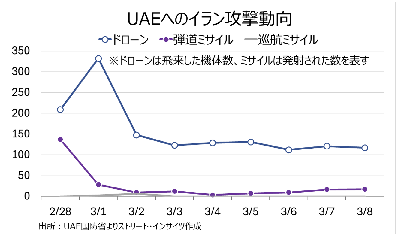 イランは報復として、イスラエルおよび湾岸諸国、米軍基地に向けた弾道ミサイル発射とドローン攻撃を開始した。アラブ首長国連邦(UAE)国防省は、イランが2月28日時点で137発の弾道ミサイルを発射し、3月1日にドローンを332機飛ばしたと報告したが、3月8日時点で弾道ミサイルは17発、ドローンは117機と当初を大幅に下回る。米統合参謀本部は、開戦時と比べてイランの弾道ミサイル発射ペースが約86%減少したと説明。これは、米・イスラエル軍がイラン国内の発射機、燃料施設、兵器貯蔵施設などを集中的に破壊している結果とみられるが、2月28日と3月1日以外は、概ね横ばいを維持しているとも言えそうだ。