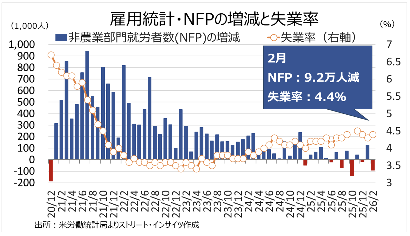 チャート:米2月雇用統計・NFPは前月比9.2万人の減少、失業率は4.4%へ上昇