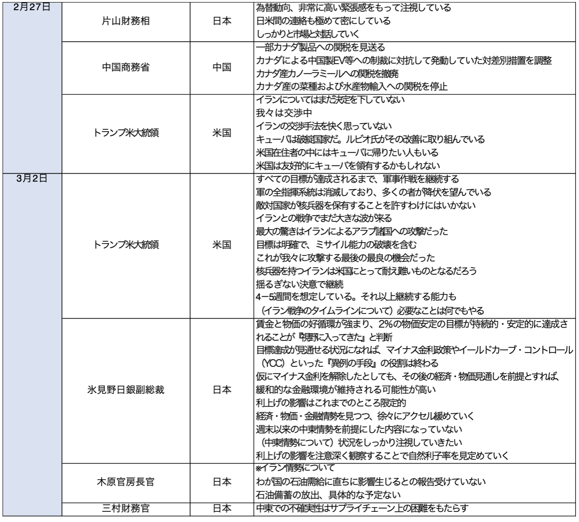 当該週、政府が日銀審議委員の後任に2人のリフレ寄りを提示し、ドル円は上昇。植田総裁が読売新聞のインタビューで春の利上げ姿勢を強調したものの、2月28日に米国とイスラエルがイランに軍事作戦を開始した結果、ドル独歩高の展開を迎えた。