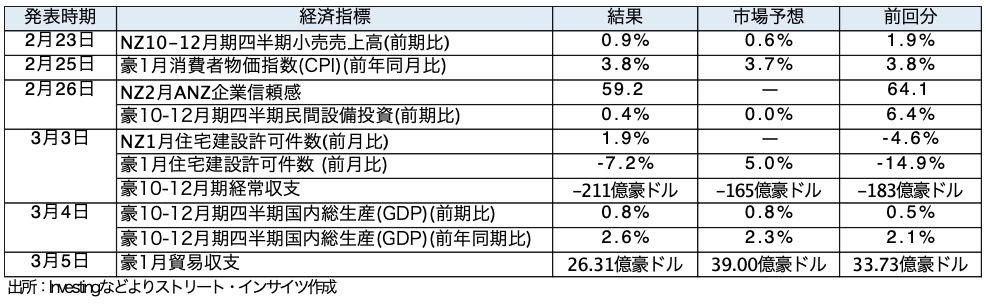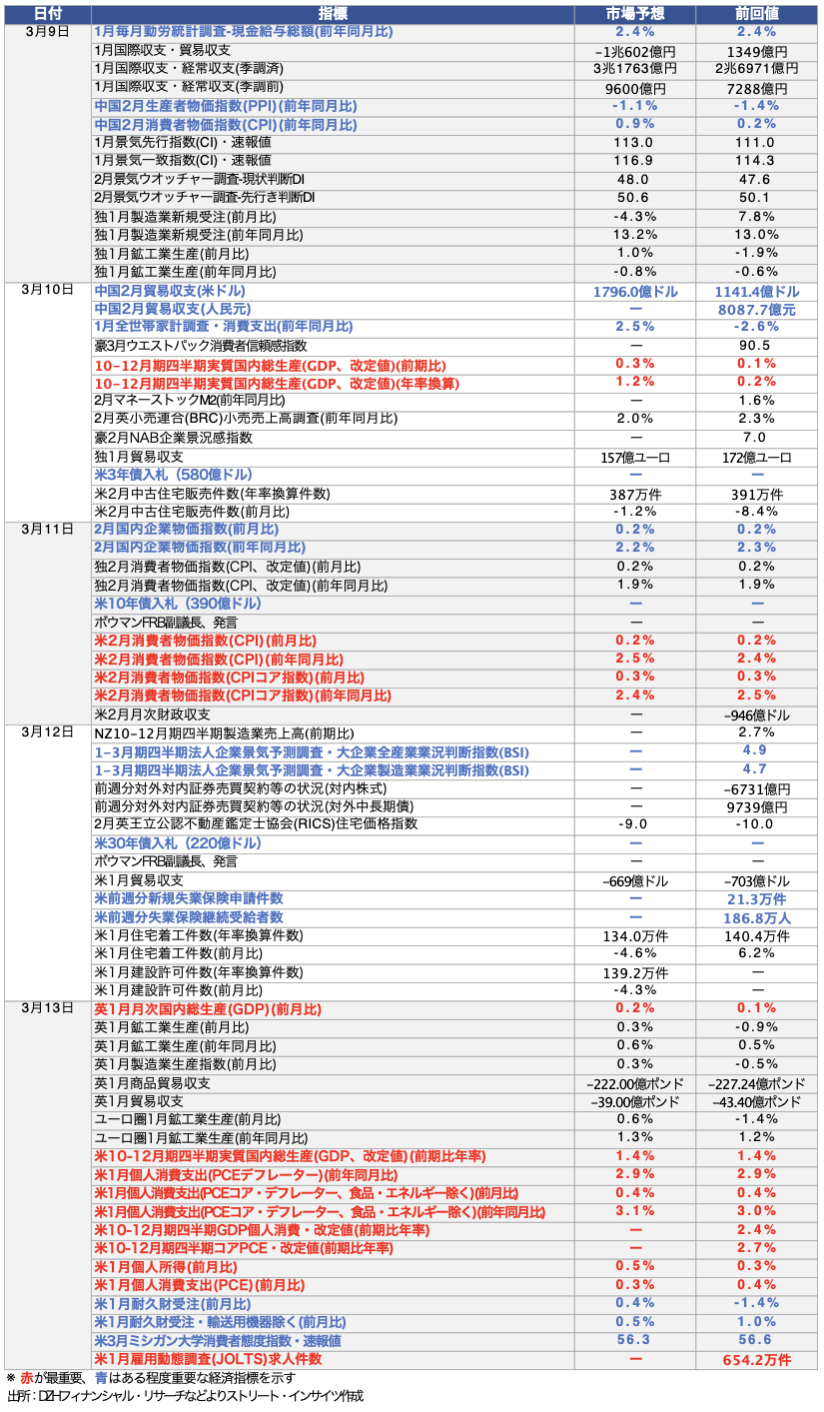 - 3月9日週の主な経済指標をみると、9日は日本1月実質賃金と国際収支、中国2月消費者物価指数(CPI)と生産者物価指数、10日は中国2月貿易収支、日本Q4実質GDP成長率・改定値などが控える。11日は日本2月企業物価指数、米2月CPI,12日は日本Q1法人企業景気予測調査、米新規失業保険申請件数、米1月住宅着工件数、13日は米Q4実質GDP成長率改定値、米1月PCE価格指数、米1月耐久財受注、米3月ミシガン大学消費者信頼感指数・速報値、米1月求人件数などを予定する。