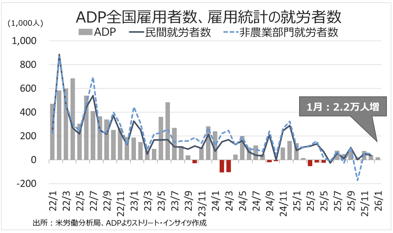 米1月ADP全国雇用者数は前月比2.2万人増と、市場予想の4.8万人増だけでなく前月の3.7万人増(4.1万人増から下方修正)を下回った。なお、ADPはベンチマーク改定を実施、2025年は39.8万人増と、改定前の51.2万人増を下回る結果に。2024年の77.1万人増にも届かなかった。