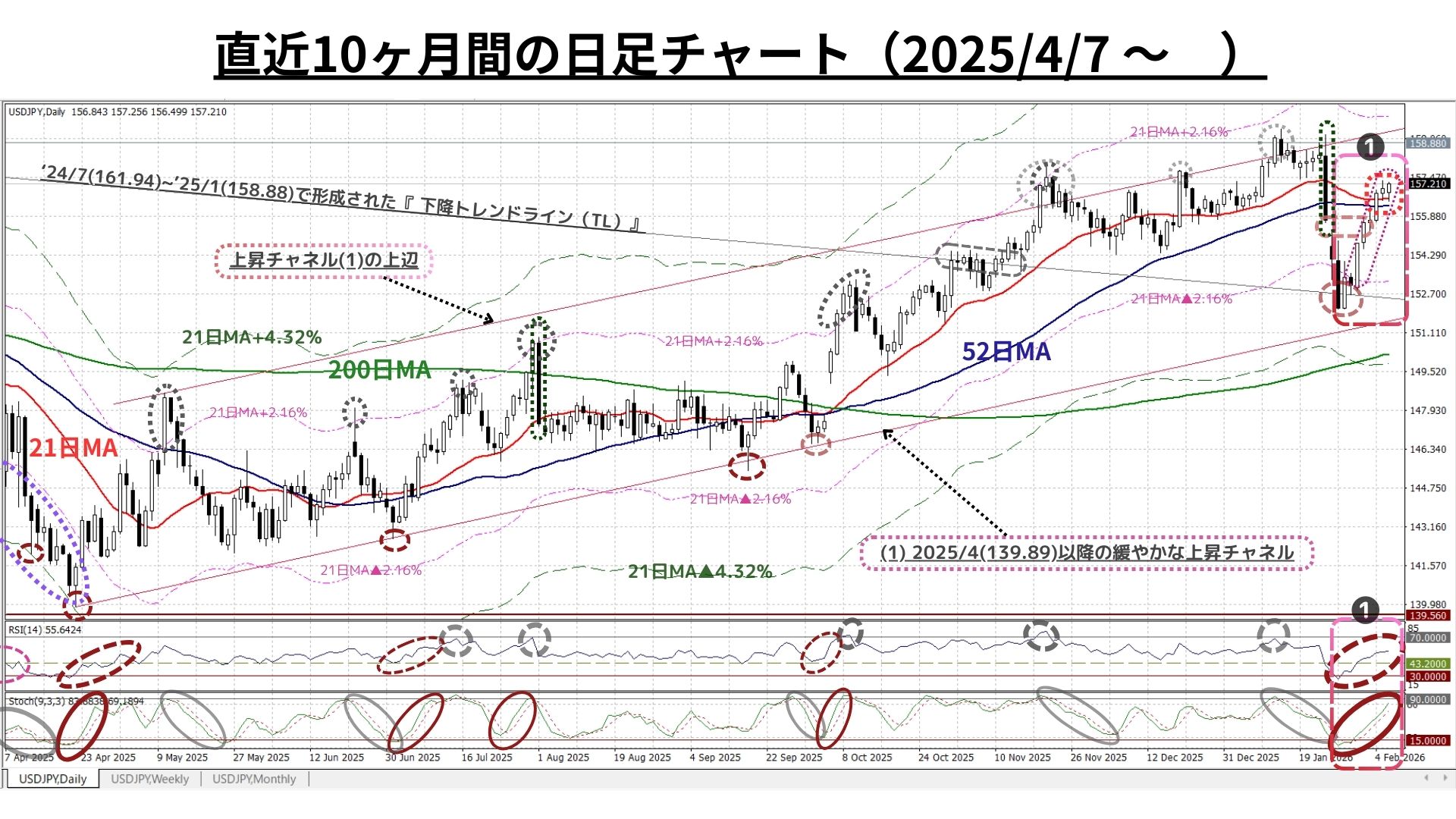 ➊日足チャート:「21MA±4.32%のバンド、52MA & 200MA」、RSI等