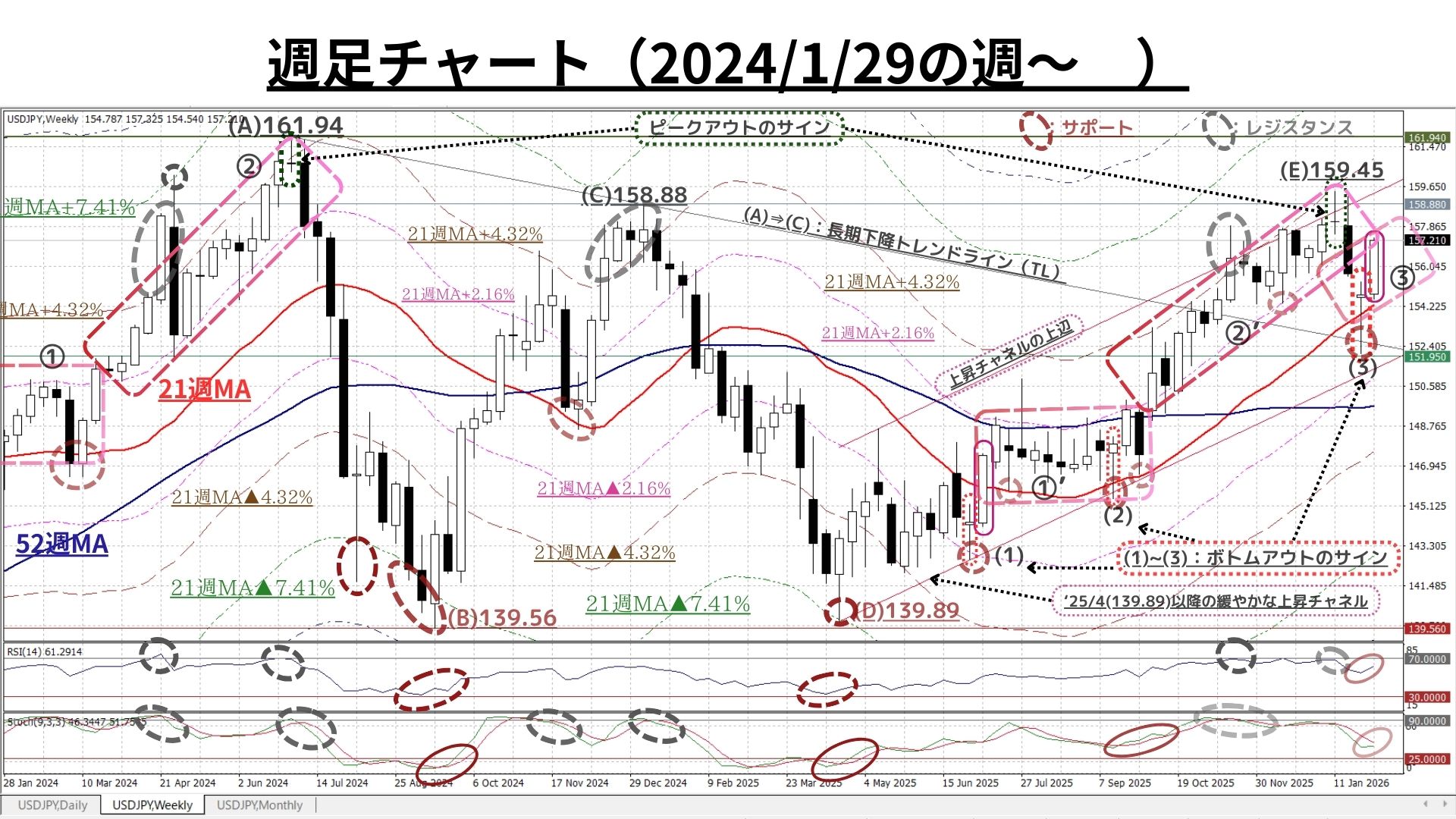 ➋週足チャート「21MA±4.32%/±7.41%/±9.87%のバンド & 52MA」、RSI等
