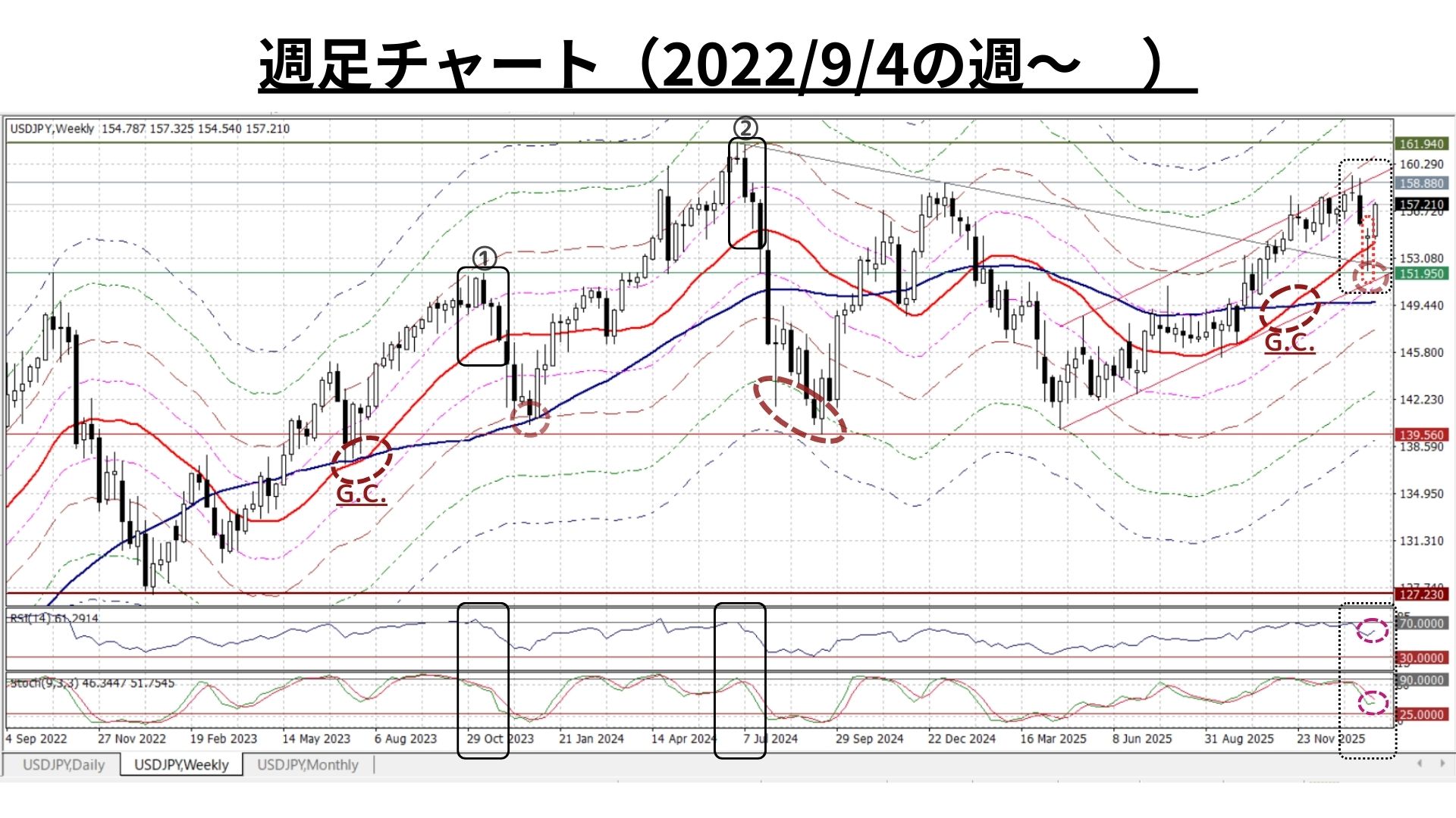 ◇週足:2025/4/22(139.89円)以降の緩やかな上昇トレンドにおいて、今回を含めて3度のボトムアウト(底打ち/反発)のサイン<「下ヒゲのかなり長い小陽線」>あり