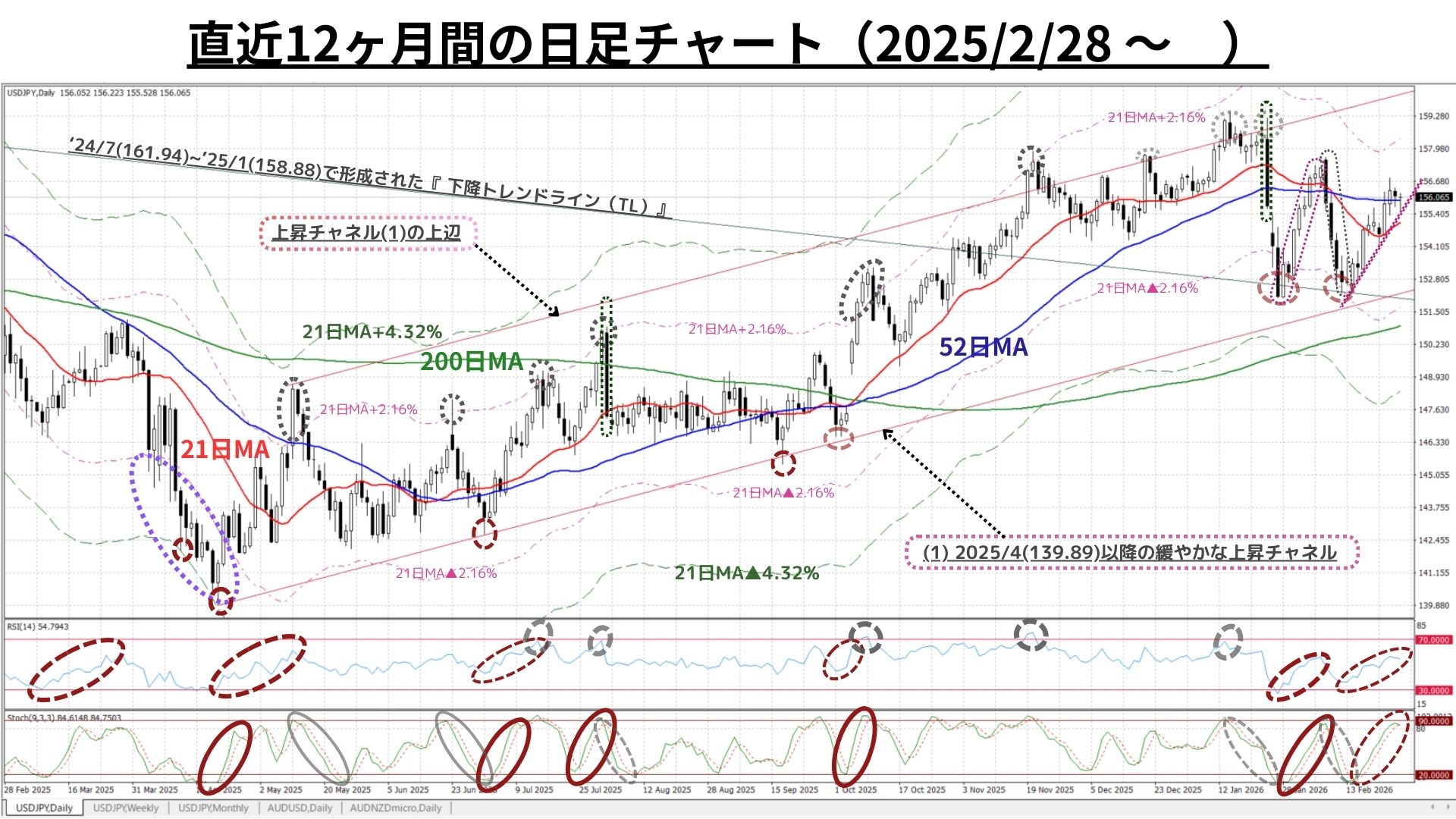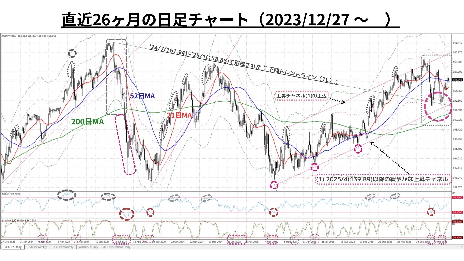 ➊日足チャート:「21MA±4.32%のバンド、52MA & 200MA」、RSI等