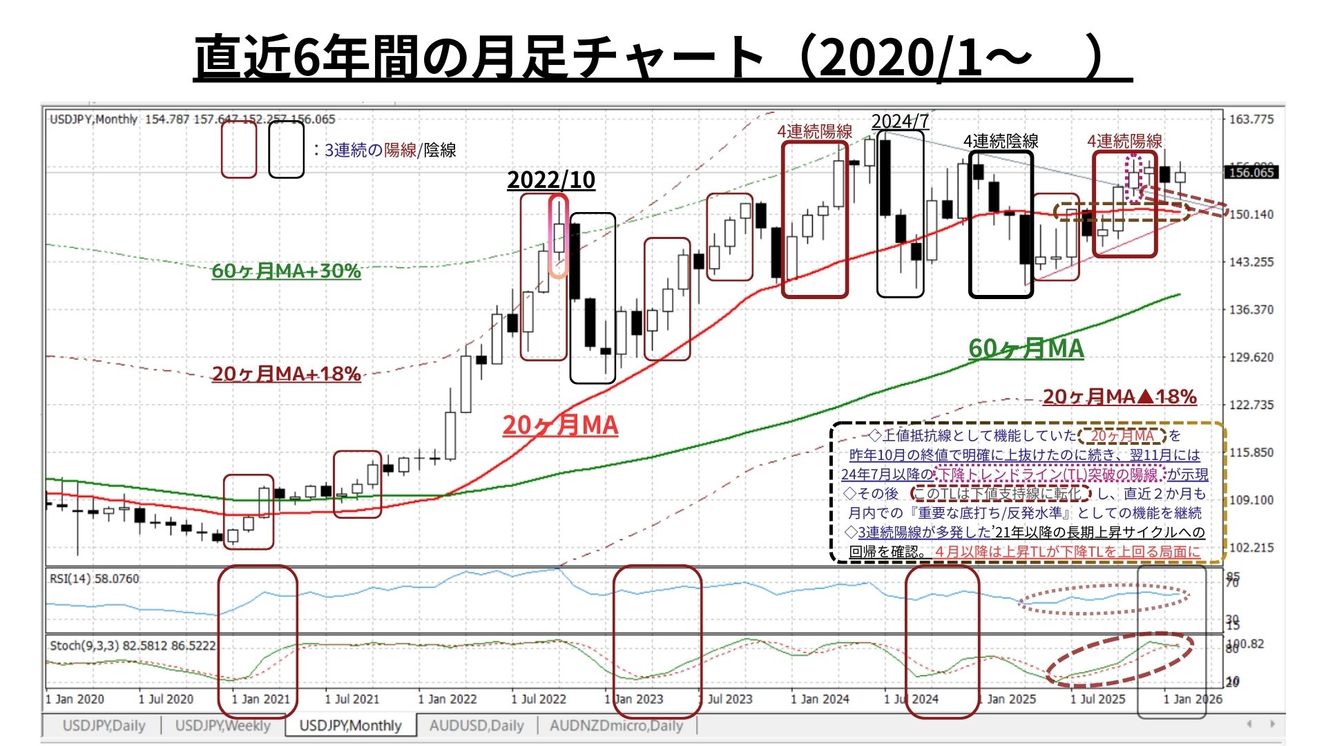 ➌月足チャート「20MA±18.0%のバンド」「60MA±30.0%のバンド」、RSIを付記