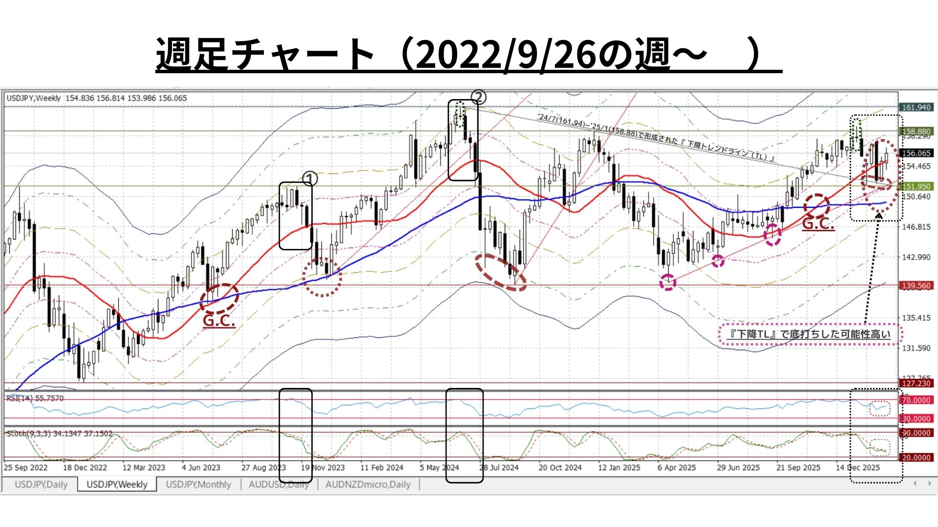 • 中期時間軸では、RSIやストキャスティクスには「低下余地が残存」